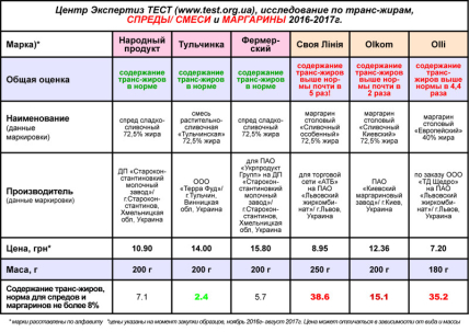 Для большей убедительности, мы приведём результаты независимой экспертизы масложирового рынка Украины. Основой тестирования выборочных образцов смеси, спреда и маргарина является содержание транс-жиров и соответствие состава продукта маркировке на упаковке.