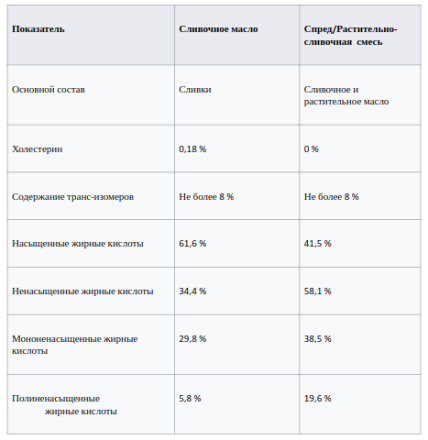Спред и растительно-сливочная смесь – натуральный диетический продукт, способствует здоровому уровню холестерина в организме благодаря растительному маслу в составе. Уровень транс-жиров регулируется государством и не должен превышать 8%, что безопасно для здоровья. Рекомендуется как диетическая альтернатива маслу, а так же для кулинарии и выпечки.