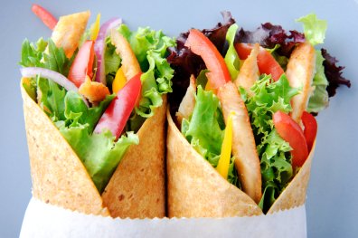 Разложи лаваш, намажь его соусом, выложи листья салата, затем горячее филе, сразу же сыр, чтоб он успел расплавиться немного. Сверху выложи овощи и еще 1 чайную ложку соуса. Сверни это все в ролл.