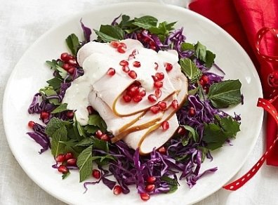 Разложите на блюдо нашинкованную капусту и травы. Сверху выложить кусочки индейки. Посыпьте зернами граната и полейте соусом перед подачей.