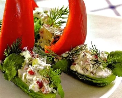 5. Все ингредиенты смешать с огурцами и творогом, добавить паприку, соль и перец. Начинить “лодочки”, украсить сладким перцем, веточками зелени.