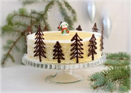 Обсыпьте края торта кокосовой стружкой, украсьте шоколадными елочками.