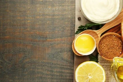 Ингредиенты: желтки: 2 шт, оливковое масло — 200 мл, соль — 0,5 ч.л, сахар — 1 ч. л, лимонный сок — 1 ст.л, классическая горчица без добавок — 1 ч. л.