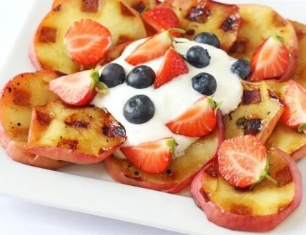 Подавать десерт из яблок, запеченных вафельнице, нужно сразу же, полив медом или греческим йогуртом.