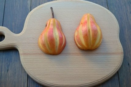 Крупную сладкую грушу вымойте, разрежьте пополам, удалите сердцевину и сделайте по поверхности неглубокие продольные желобки. Просушите грушу бумажными салфетками, чтобы удалить лишний сок.