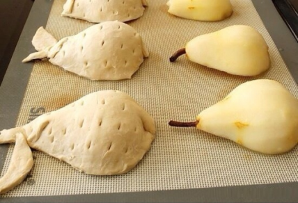 Раскатайте пласт слоеного теста, и накройте им груши. Излишки теста срежьте. Сделайте на слое теста насечки, чтобы пар от груш мог свободно выходить.