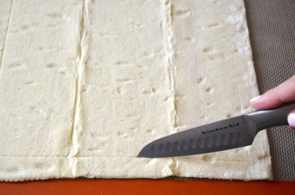 Расстелите лист размороженного теста на пергаментной бумаге для выпечки. Расчертите его острым ножом: отчертите, не прорезая тесто, бортики шириной 1,5 см. По всей поверхности листа сделайте проколы вилкой.