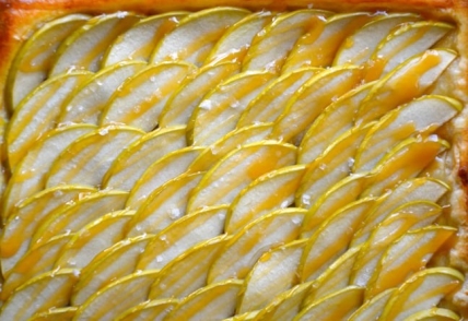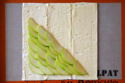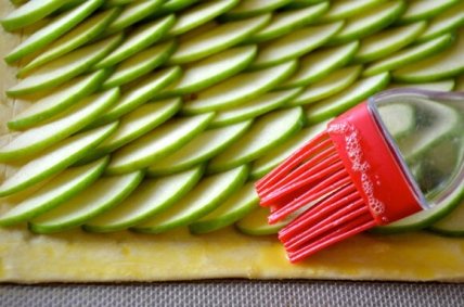 С каждого ломтика яблок стряхните выступивший сок, и аккуратно разложите их на поверхности теста, внутри отчерченных границ.