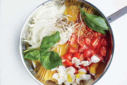 В сковородку выложите все ингредиенты: спагетти, помидоры, лук, чеснок, базилик, острый перец, соль, свежий молотый черный перец и