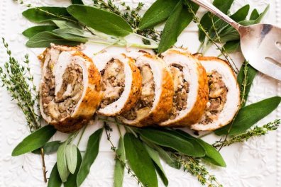 Праздничный рулет из индейки с грибами и сыром