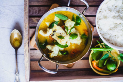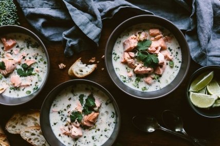 Нарежьте крупными кубиками картофель и тыкву (каждого овоща по чашке). Залейте полутора литрами кипятка, горячего овощного или рыбного бульона, положите две веточки кинзы, их можно потом вытащить.