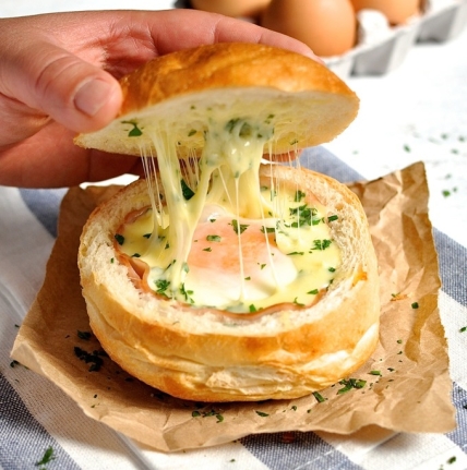 Классная идея для завтрака. А если взять яичницу в хлебе, завернутую в фольгу, с собой на работу, она останется теплой, вкусной и ароматной до обеда.