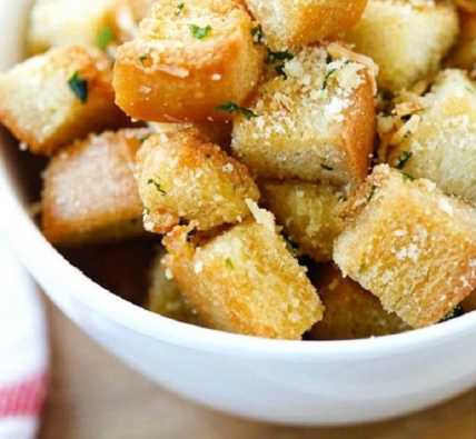Подсушивайте сухарики из черствого хлеба 8-10 минут при температуре 180 градусов. Когда края круттонов зарумянятся, выньте их, и еще горячими посыпьте тертым пармезаном.