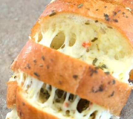Сыр нарежьте тонкими ломтиками. В багете сделайте 10-12 надрезов. В каждый из них, как в кармашек, заложите охлажденную масляную смесь и 11-2 ломтика сыра.