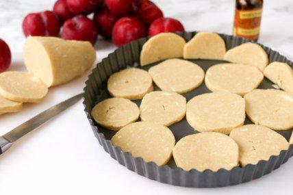 4. Обрежьте края теста для сливового пирога, чтобы они не выходили за края формы, и поставьте обратно в холодильник на минут 10, пока нарезаются сливы.