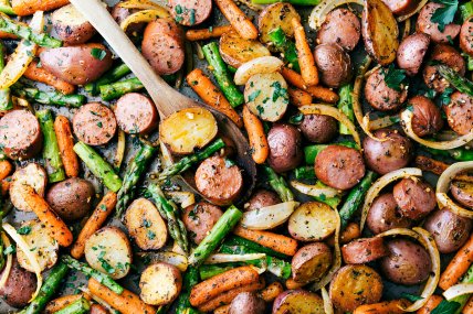 Печеный картофель с колбасками. Еще один вариант сытного ужина, который готовится на раз-два. Чеснок, картофель, аспарагус, морковь, лук и колбаски порежьте кусочками, выложите все на один противень и перемешайте. Присыпьте специями по вкусу, а также сбрызните оливковым маслом. Запекайте в духовке 30-40 минут.