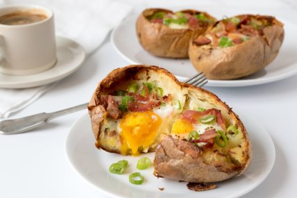 Картофель, запеченный с яйцом. Такое блюдо из картошки станет интересным вариантом к завтраку и непременно удивит родных. Предварительно отварите несколько самых больших клубня картошки. Срежьте аккуратно верхушки и ложкой достаньте серединку. В образовавшиеся "лодочки", насыпьте натертый сыр, кусочки бекона и вбейте в каждую по яйцу. Сверху все посыпьте солью и перцем, и поставьте в духовку на 10-15 минут запекаться.