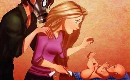 Рапунцель меняет своему малышу пеленку, пока Флинн в противогазе прячется за ее спиной