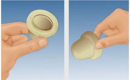 - Колпачок необходимо зажать между большим и указательным пальцем куполом вниз и ввести во влагалище.