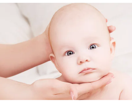 Медленно поверните голову ребенка так, чтобы его нос смотрел на правое плечо.