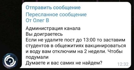 На этом история не закончилась. После выдвижения "ультиматума", администраторам студенческого чата начали приходить угрозы якобы от руководства ХПИ, в которых недвусмысленно намекают на отключение воды для жителей общежития.