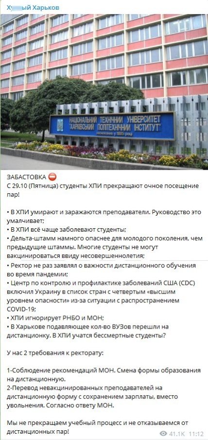 Студенты Харьковского политехнического института объявили забастовку из-за игнорирования ВУЗом рекомендаций Минобразования относительно дистанционного образования и якобы столкнулись с угрозами со стороны руководства.