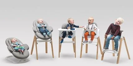 Этот простая в использовании система включает в себя кресло-качалку (шезлонг) для новорожденных с ремнями безопасности, высокий детский стульчик для кормления и детский стул, составляющие которых специально созданы таким образом, чтобы Steps - действительно был единственным стулом, который понадобится на всех этапах развития ребенка.