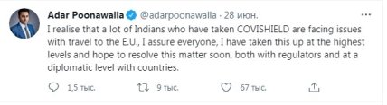 О том, что Covishield не попал в этот список сообщил генеральный директор компании производителя Института сывороток Индии (Serum Institute of India) Адар Пунавалла - через официальный аккаунт в Твиттере.