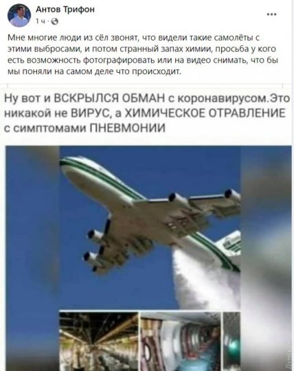 Депутат горсовета Одессы Трифон Антов от партии "За будущее" заподозрил, что нынешняя эпидемия COVID-19 связана не с распространением коронавируса, а с выбросами "химии" с таинственных самолетов.
