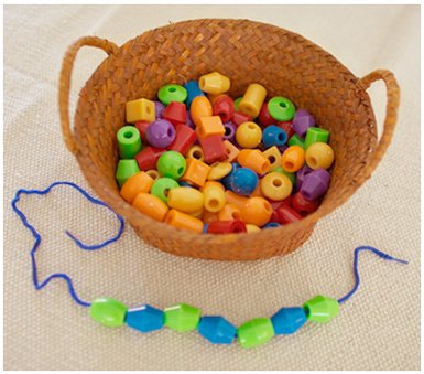 Бусинки разных форм и цветов. Используя лишь разноцветные бусинки и шнурки, предложите ребенку сделать украшение, например, бусы для мамы своими руками. Можно нанизывать только бусинки определенных цветов и форм или полностью фантазировать.