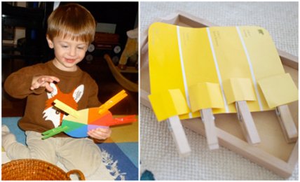 Цвета. Игра с сопоставлением цветов очень популярна в занятиях для раннего развития ребенка. Все, что потребуется — разноцветные прищепки и картонный круг с соответстующими по цветам ячейкам или картонки разных цветов. Ребенку очень понравится разучивать цвета в игровой форме.