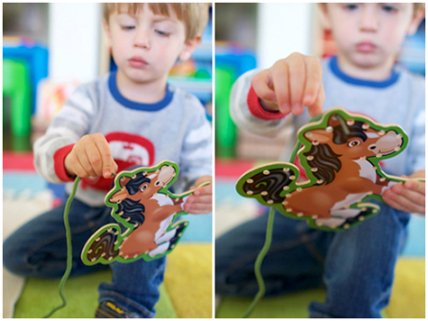 Животные-шнуровки. Используйте специальные рамки с отверстиями для шнуровки или сделайте макет самостоятельно. Пусть малыш играется со шнурком, развивая при этом свою мелкую моторику. Такие игры отлично подготавливают ребенка к самостоятельному завязыванию шнурков. Больше идей, как научить ребенка завязывать шнурки, читайте по ссылке.