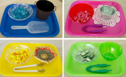 Монетки, бусинки, камушки. Перекладывание мелких предметов из одной посудины в другую при помощи щипцов или лопатки — довольно непростое занятие для маленьких пальчиков. Но оно хорошо развивает мелкую моторику ребенка.