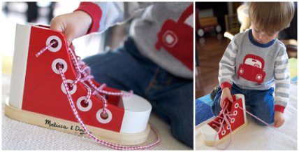 Обувь. Игры со шнурками прекрасно развивают мелкую моторику ребенка. Подобный деревянный макет ботинка можно с легкостью заменить нарисованными кедами и дать ребенку зашнуровывать их. Родителям нужно лишь проделать несколько дырочек на картоне.