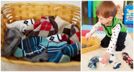 Носочки. Перемешайте в корзине носочки малыша, а он пусть разложит их по парам. В такую игру можно превратить даже разбор мокрого белья после стирки, к тому же ребенок с радостью почувствует себя маминым помошником.