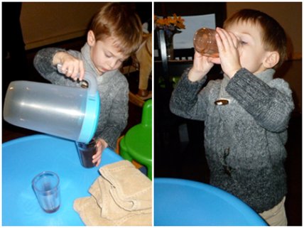 Сок. Цель упражнения — научить малыша самостоятельности и аккуратности. Ребенок при этом сам наливает себе сок в стакан. Чтобы разнообразить упражнение, можно предложить узнать вкус сока с закрытыми глазами.