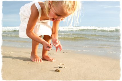 Самое банальное занятие на пляже с ребенком может превратиться в увлекательную игру. Главное взять с собой ведерко, лопатку, грабли и пасочки. Из мокрого песка можно сделать все, что угодно: и замок, и животных, и самолеты-поезда-автомобили, украсить все это можно с помощью камней, ракушек, травы, водорослей и т.д. Обязательно подбадривайте и поддерживайте малыша, делитесь с ним идеями и давайте задания. К примеру, попросите его построить домик для черепашки, которую, тоже нужно сделать из песка, предложите ребенку "приготовить" из песка пирожки, тортик. Можно построить из песка лабиринт и находить выход из, казалось бы, безысходных ситуаций.