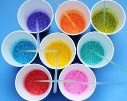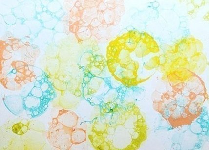 Опустите в стакан трубочку и дуйте в нее, чтобы раствор вспенился и взялся крупными пузырями. Наклонив стакан, выложите эти пузыри на бумагу, в разных частях листа. Так же вспеньте по очереди каждый стаканчик, и распределите цветными пятнами по листу. Если пятна будут наползать друг на друга – не страшно, это создаст интересный цветовой переход.