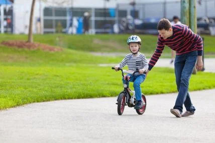Объяснитеребенку, что двухколесныйвелосипедедеттолькопокавращаютсяколеса. Педалинужнокрутитьпостоянно, иначевелосипедупадет. Новырядом, и выподстрахуете его наэтотслучай.