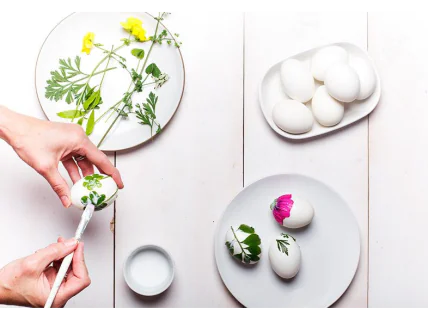Чтобы сделать оригинальные крашенки к Пасхе, воспользуйтесь листочками пряной зелени – укропа, петрушки, кинзы или рукколы. Подойдут также и листики комнатных растений, если они достаточно ажурны, цветы (фиалки, барвинок).