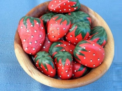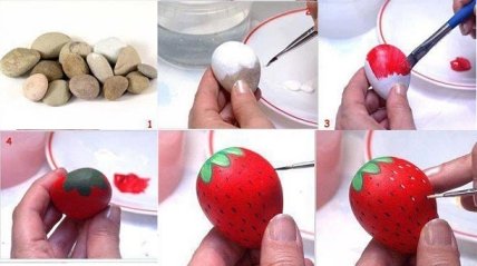 Вымойте и высушите камешки, чтобы на них не осталось песка или пыли. Загрунтуйте их белой краской, затем выкрасьте в красный цвет и дополните «листиками» и «семенами».