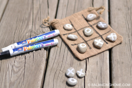 Чистые камешки снабдите пометками в виде крестиков и ноликов. Это можно сделать обычным фломастером. При желании вскройте камни акриловым лаком из баллончика. Игровое поле можно начертить прямо на мешочке для камней. Получится отличный подарочный набор для любителей сразиться в интеллектуальную экспресс-игру.