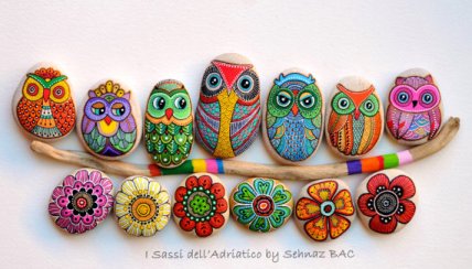 Эти совушки, разрисованные в стиле дудлов, тоже могут быть и отдельными игрушками из морских камней, и деталями панно в детской. Помните, как мы в детстве перед сном разглядывали узоры на бабушкином ковре? Подарит ребенку такой же пир фантазии.