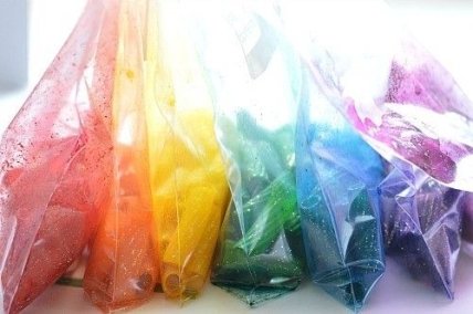 Добавьте в мешочки с красителями макароны, плотно закройте их и встряхните.
