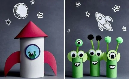 Наверное, каждый ребенок, который увлекается темой космоса, мечтает туда полететь, когда вырастет. Подхватите эту тему и пусть малыш пофантазирует, ведь детки любят воображать себя кем-то во время игр. Предложите ему смастерить ракету из втулок от туалетной бумаги для своего полета и пусть играет такой поделкой из бумаги, представляя себя космонавтом, который летит на Луну.