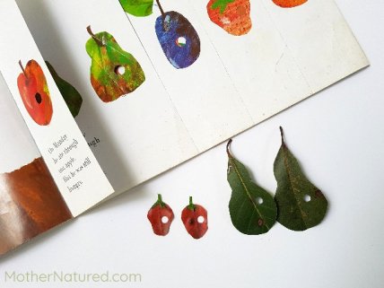 6. Хотите расширить поделку? Создайте некоторые из фруктов, описанные в книге. Например, будет очень весело сделать груши и клубнику из листьев, а затем использовать дырокол, чтобы сделать отверстие, где гусеница начала их жевать.