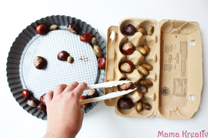 Помните сказку про Золушку, особенно тот момент, когда мачеха заставила бедную девочку перебрать горох от чечевицы? Предлагаем разивающую игру с каштанами по мотивам этой истории. Ссыпаем в одну емкость каштаны, желуди, орехи и что еще найдется под рукой. И даем задание ребенку перебрать эти дары природы и рассортировать их, например, в лоток для яиц.