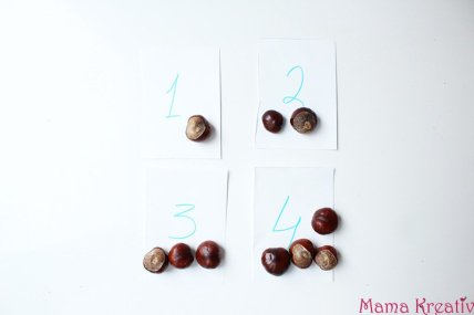 Как учить математику с помощью лего, мы уже рассказывали. А теперь покажем, как учиться считать при помощи каштанов. Для этой развивающей игры приготовьте карточки с цифрами и каштаны. Предложите ребенку положить на каждую карточку необходимое количество каштанов.