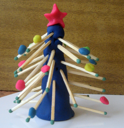 Поделки для самых маленьких мы тоже подготовили. Например, плоская елочка из пластилина, которую можно вырезать при помощи форм для печенья, и украсить пуговицами, бусинами, бисером. Или же елка, ствол которой и украшения, делаем из пластилина, а ветки - из спичек.