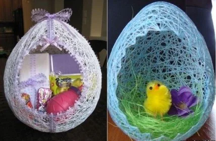 Эти ажурные яйца-корзинки можно легко сделать из проклеенной нити, обмотанной вокруг воздушного шара. Получается необычная и нарядная упаковка для пасхальных подарков.